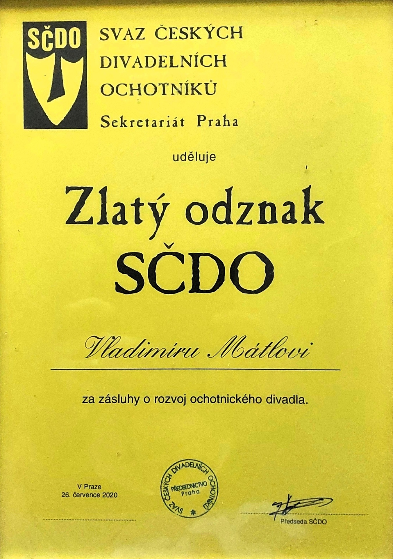 V roce 2020 obdržel Vladimír Altán Mátl Zlatý odznak J. K. Tyla